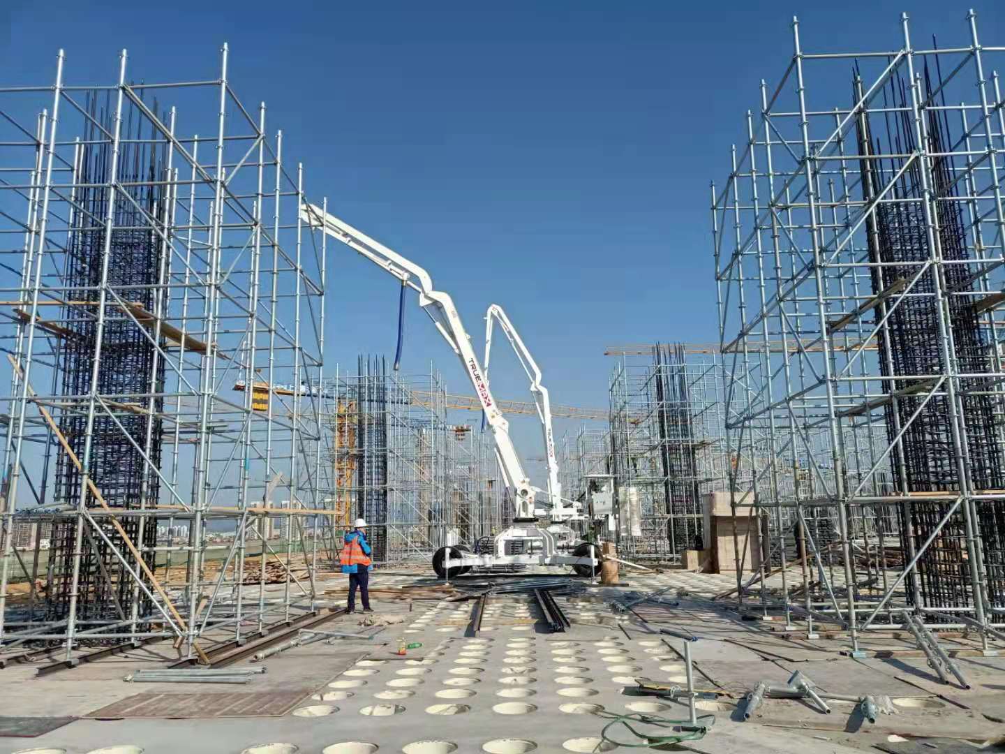 臂架分為三節(jié),全液壓驅(qū)動,折疊、展開靈活方便,并且可360°回轉(zhuǎn),布料范圍廣。 (2)可選擇無線遙控,或有線遙控操作方式,操作輕松方便。